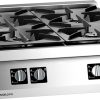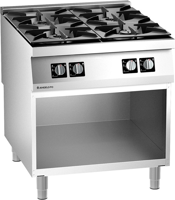 Burner gas boiling range made of AISI 304 stainless steel, 20/10 mm thickness top. Top grids and burners in enamelled cast iron. Valve controlled removable burners with double and single crown burner cap. Pilot light and thermocouple. Pressed and sealed burner recess. Open lower compartment.