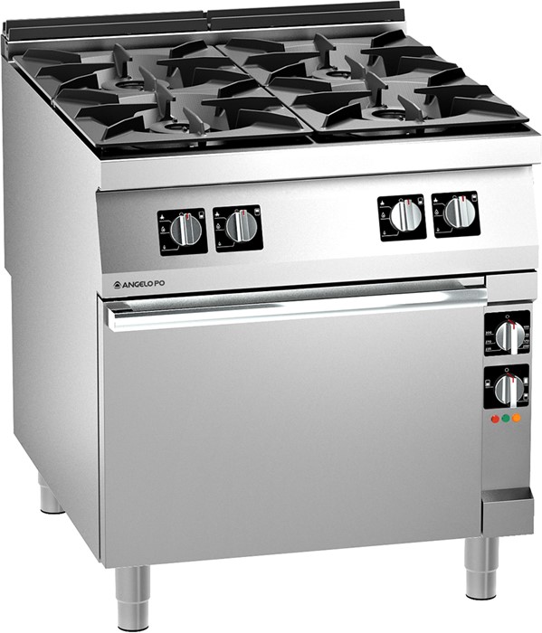 Burner gas boiling range made of AISI 304 stainless steel, 20/10 mm thickness top. Top grids and burners in enamelled cast iron. Valve controlled removable burners with double crown burner cap. Pilot light and thermocouple. Pressed and sealed burner recess. Electric static oven in AISI 430 stainless steel with thermostat, removable stainless steel guides useful for GN 2/1 containers.