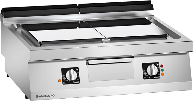 Multifunction plate with AISI 304 stainless steel structure, 20/10 mm thickness top. Cooking plate in polished AISI 430 stainless steel, suitable for direct or indirect cooking. Working top with inclined recess for collecting liquids (plate cap included), front discharge in drawer integrated in the dashboard. 2 cooking independent areas controlled by temperature thermostat, adjustable 110-360°C. Heating by brazed-welded heating elements. Pre-setting for remote control of power peaks.