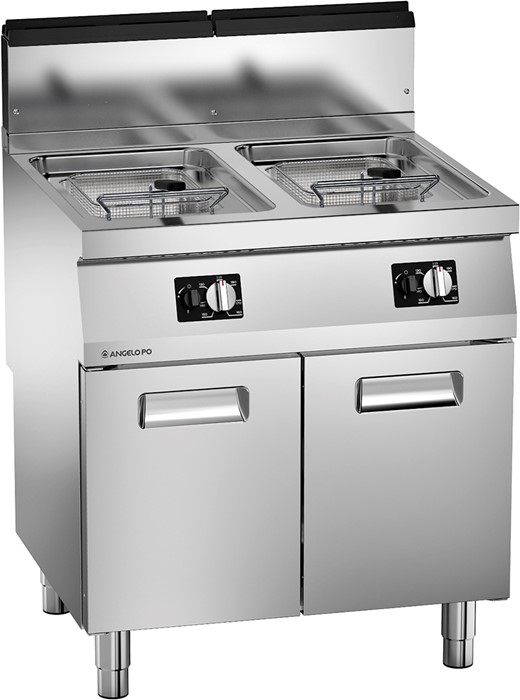 Fryer made of AISI 304 stainless steel, 20/10 mm thickness top. Pressed “V” wells – without burner in – sealed into top, generously coved with large drain zone; each well delivered with 1 basket and 1 lid. Mechanical controls. Temperature controle through thermostat 100-190°C. Heat exchange pipes outside the well. Piezoelectric ignition of the pilot light, safety thermostat.