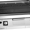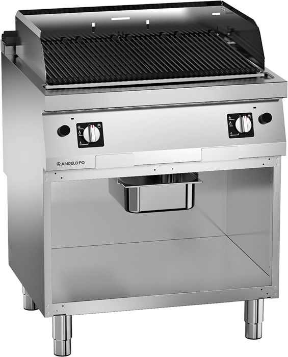 Grill range made of AISI 304 stainless steel, 20/10 mm thickness top. Cooking griddle made of enamelled cast iron with special nanotechnology surface treatment for a better fats sliding, delivered with stainless steel splash guards and cleaning brush. Heating by two independent gas burner controlled by pilot light, thermocouple and piezo-electric ignition. Cooking through radiation of ceramic bricks heated by the burner. Integrated lower open compartment.