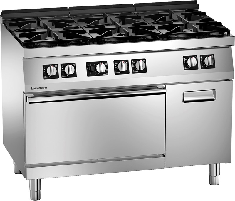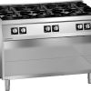 Burner gas boiling range made of AISI 304 stainless steel, 20/10 mm thickness top. Top grids and burners in enamelled cast iron. Valve controlled removable burners with double crown burner cap. Pilot light and thermocouple. Pressed and sealed burner recess. Gas static oven in AISI 430 stainless steel with removable stainless steel guides and thermostat, useful for 2/1 GN containers. Side cabinet with door, equipped with tray guides useful for 4 x GN 1/1 containers.