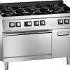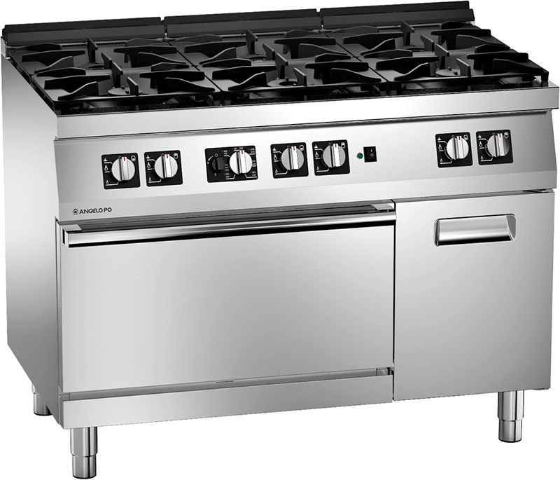 Burner gas boiling range made of AISI 304 stainless steel, 20/10 mm thickness top. Top grids and burners in enamelled cast iron. Valve controlled removable burners with double crown burner cap. Pilot light and thermocouple. Pressed and sealed burner recess. Gas convection oven in AISI 430 stainless steel with removable stainless steel guides and thermostat, useful for GN 1/1 containers. Side cabinet with door, equipped with tray guides useful for 4 x GN 1/1 containers.