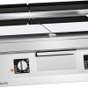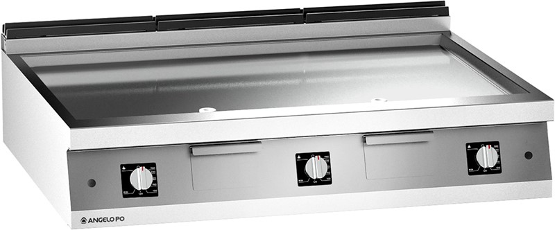 Griddle made of AISI 304 stainless steel, 30/10 mm thickness top. Cooking plate in compound (AISI 316L stainless steel+FE). Delivered with: plate plug. Heating by three independent burner groups controlled by modulating thermostat valve. Working temperature (min-max): 120-320°C.