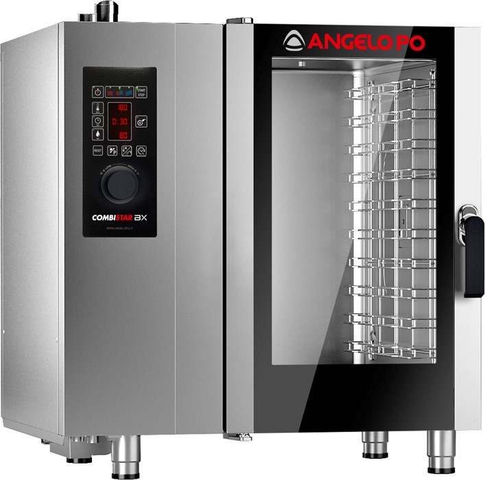 Combi oven (steam, hot air, combi) with digital display and library programs. Steam generation dual level. Fan with automatic rotation reverse. Active humidity control while cooking. Automatic washing system with triple-action cleaning effect, totally automatic, requiring no outside help for every single washing and the operator does not handle the chemical product. Seven washing programs. Structure made in AISI 304 stainless steel, AISI 316L in cooking chamber.