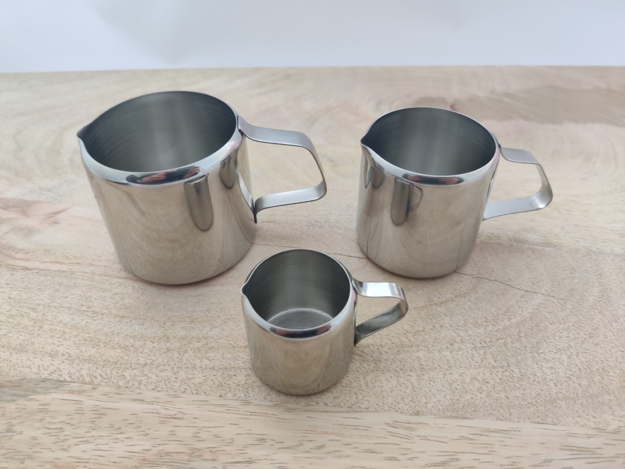 Fløde- eller mælkekander i stål med håndtag og en lille hældetud.