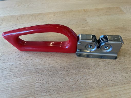 Knivsliber med slebet cementeret stål og rektificerede skiver i et rustfri stålhus. Håndgreb af polypropylen.