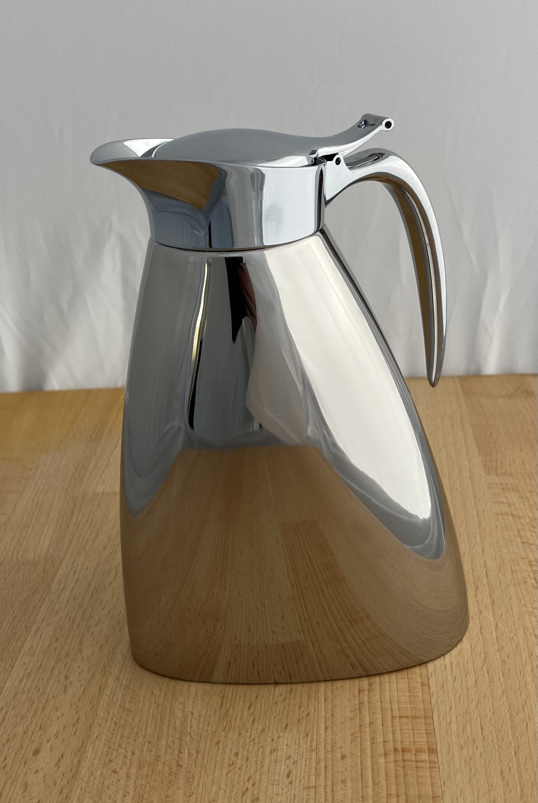 Termokanden er udstyret med et funktionelt klaplåg, der muliggør enhåndsbetjening – særligt praktisk når du skal servere for flere personer samtidig. Den ergonomiske hank og præcise hældetud i forkromet fuldmetal sikrer, at serveringen foregår uden spild, mens det højglanspolerede ydre i rustfrit stål tilfører et tidløst og eksklusivt udtryk.